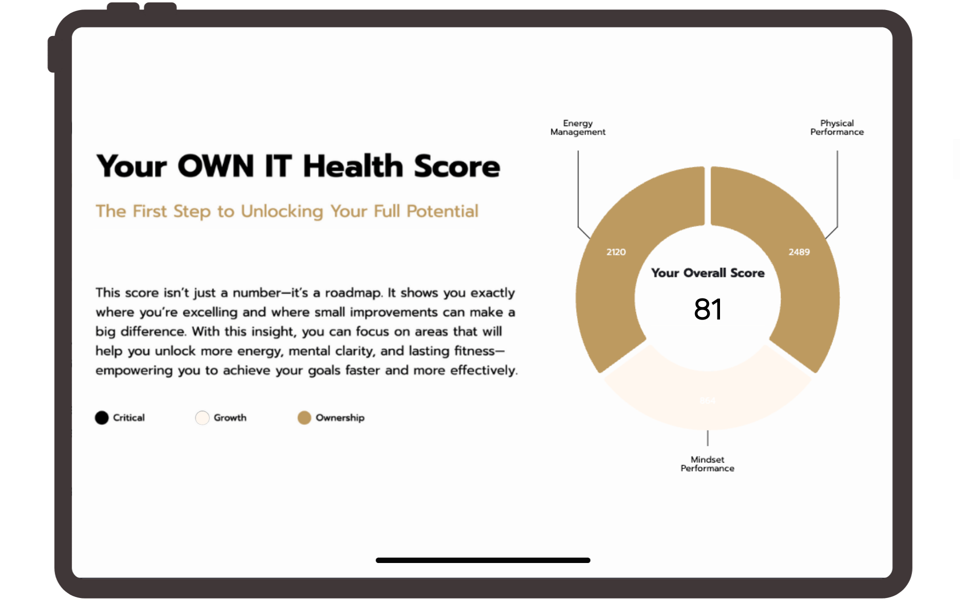 This assessment will give you the insights you need to build lasting fitness, energy, and mental sharpness, so you can perform at your best every day.